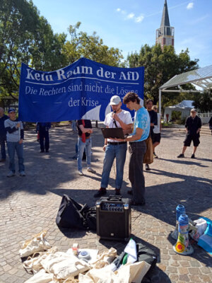 Martin Spreng ist in zahlreichen Initiativen aktiv, so auch beim Bündnis gegen Rechts in Calw, Pforzheim und Karlsruhe. Er kritisierte auch die alljährliche Nazimahnwache auf dem Wartberg und rief zur Teilnahme an der Gegendemo am 20.2.2010 in Pforzheim auf (Treffpunkt 14.00 am Waisenhausplatz). Für seine Arbeit wurde er anschliessend vom DGB-Bezirksvorsitzende Rainer Bliesener belobigt, der dem "Flösserfan" Spreng noch dazu einen Gutschein für ein Buch überreichte. Einen Blumenstrauss bekam dann noch die Liedermacherin Traudel Kern überreicht. Ein warm-kaltes Büffet schloss sich an, wobei neue Kontakte geknüpft und alte vertieft werden konnten.