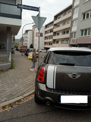 Ein mitten in der Kreuzung falsch geparkter PKW behindert hier Schulkinder