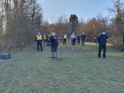 Oben: NPD-Demo 2021 am Pforzheimer Trümmerberg, am Mikrofon Edda Schmidt,